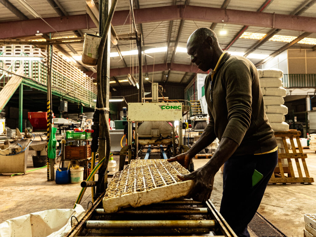 Injerto: Confimaplant realiza tarea de injertado para tomate, sandía, melón, pepino, berenjena y pimiento. La firma se ha especializado en la técnica del injerto de cuña, el cual se practica para las plántulas de tomate, sandía, melón y pepino. En sandía se injerta en torno al 90% de la producción, mientras en plantas de pepino y berenjena se practica en un 10% y en tomate un 20%.
